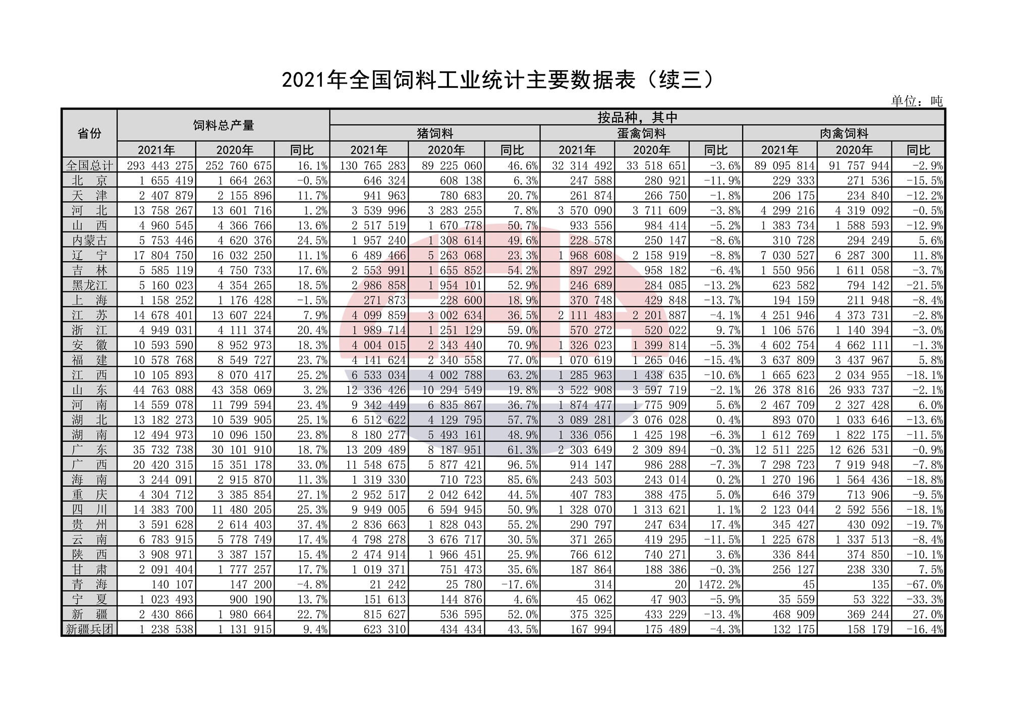 全國(guó)工業(yè)飼料總產(chǎn)量29344.3萬(wàn)噸,比上年增長(zhǎng)16.1%。其中,配合飼料產(chǎn)量27017.1萬(wàn)噸,增長(zhǎng)17.1%;濃縮飼料產(chǎn)量1551.1萬(wàn)噸,增長(zhǎng)2.4%;添加劑預(yù)混合飼料產(chǎn)量663.1萬(wàn)噸,增長(zhǎng)11.5%。分品種看,豬飼料產(chǎn)量13076.5萬(wàn)噸,增長(zhǎng)46.6%;蛋禽飼料產(chǎn)量3231.4萬(wàn)噸,下降3.6%;肉禽飼料產(chǎn)量8909.6萬(wàn)噸,下降2.9%;反芻動(dòng)物飼料產(chǎn)量1480.3萬(wàn)噸,增長(zhǎng)12.2%;水產(chǎn)飼料產(chǎn)量2293.0萬(wàn)噸,增長(zhǎng)8.0%;寵物飼料產(chǎn)量113.0萬(wàn)噸,增長(zhǎng)17.3%;其他飼料產(chǎn)量240.5萬(wàn)噸,下降16.2%。