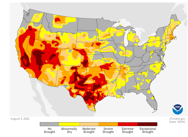根據(jù)美國(guó)國(guó)家海洋和大氣管理局(NOAA)的最新的季節(jié)性干旱展望,美國(guó)近60%地區(qū)維持干旱狀態(tài)概率超50%。美國(guó)西部持續(xù)干旱,并且南部平原和密西西比河下游同樣如此。美國(guó)西部從2022年開始持續(xù)干旱且仍將持續(xù),西部11個(gè)州的中度至特大干旱(D1至D4)的覆蓋范圍在2021年12月7日達(dá)到略低于95%的峰值之后,每周幾乎穩(wěn)定在88%到 90%之間。美國(guó)南部、西部大部分地區(qū)氣溫高于往年水平。