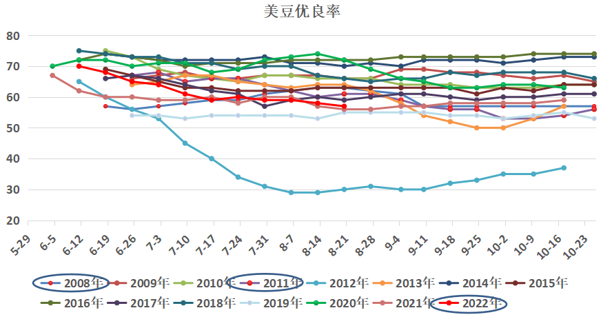 目前中國(guó)和美國(guó)大部分大豆處于結(jié)莢期,9月開始中國(guó)和美國(guó)大豆將進(jìn)入收獲期。雖然7月份美國(guó)大豆產(chǎn)區(qū)遭遇了一些干旱,但是從截止8.21號(hào)的美豆優(yōu)良率來看仍舊高于去年同期水平。