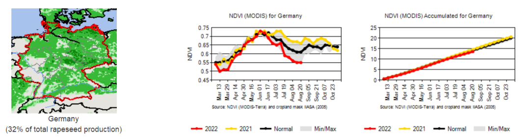 圖2:德國(guó)菜籽主產(chǎn)區(qū)及近年周度、和累計(jì)降水