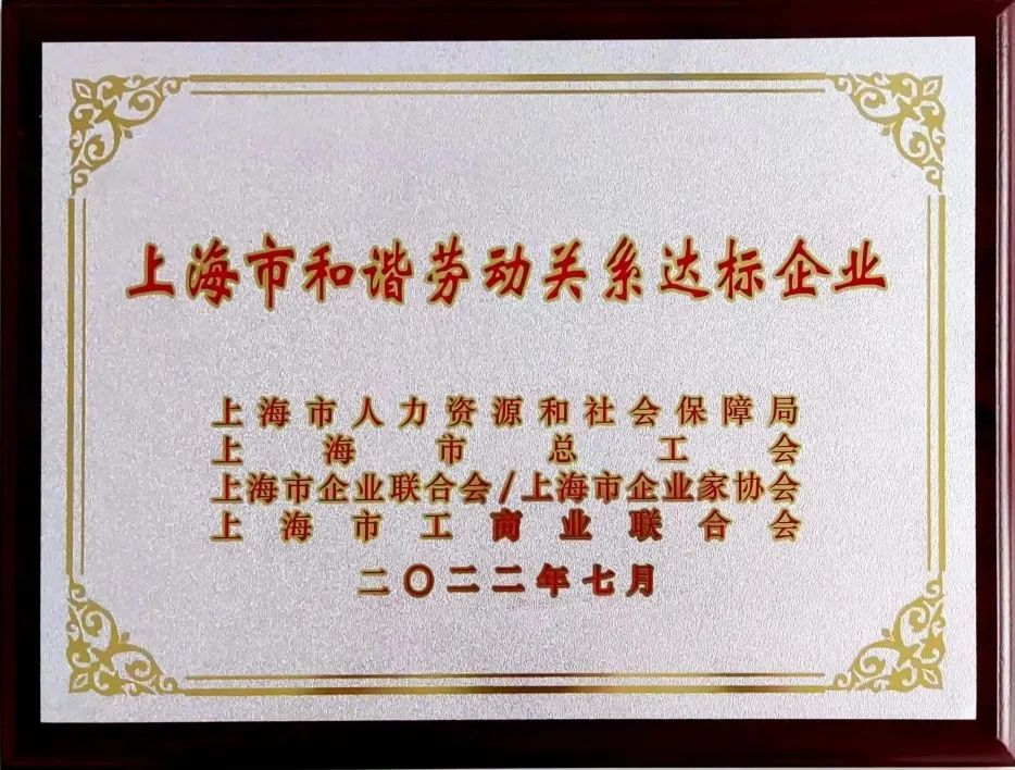 近日,我司獲得由上海市人力資源和社會保障局、上海市總工會、上海市企業(yè)聯(lián)合會、上海市企業(yè)家協(xié)會、上海市工商業(yè)聯(lián)合會共同評審、聯(lián)合頒發(fā)的2021年度“上海市和諧勞動關(guān)系達標(biāo)企業(yè)”稱號。