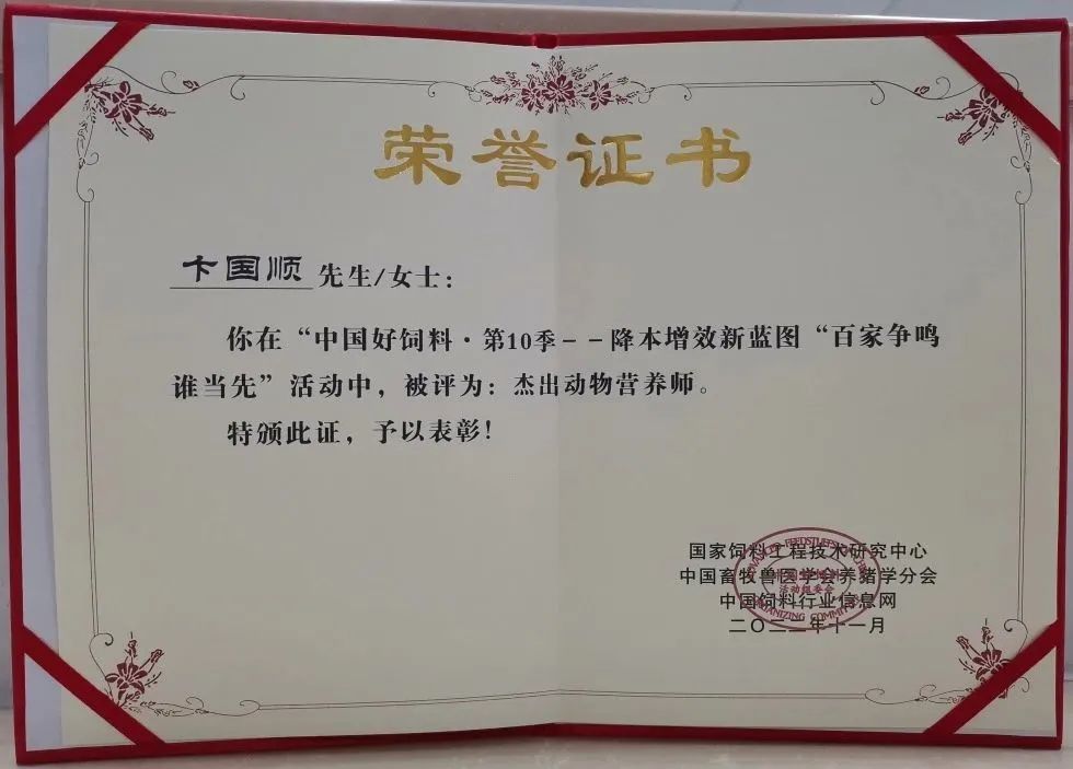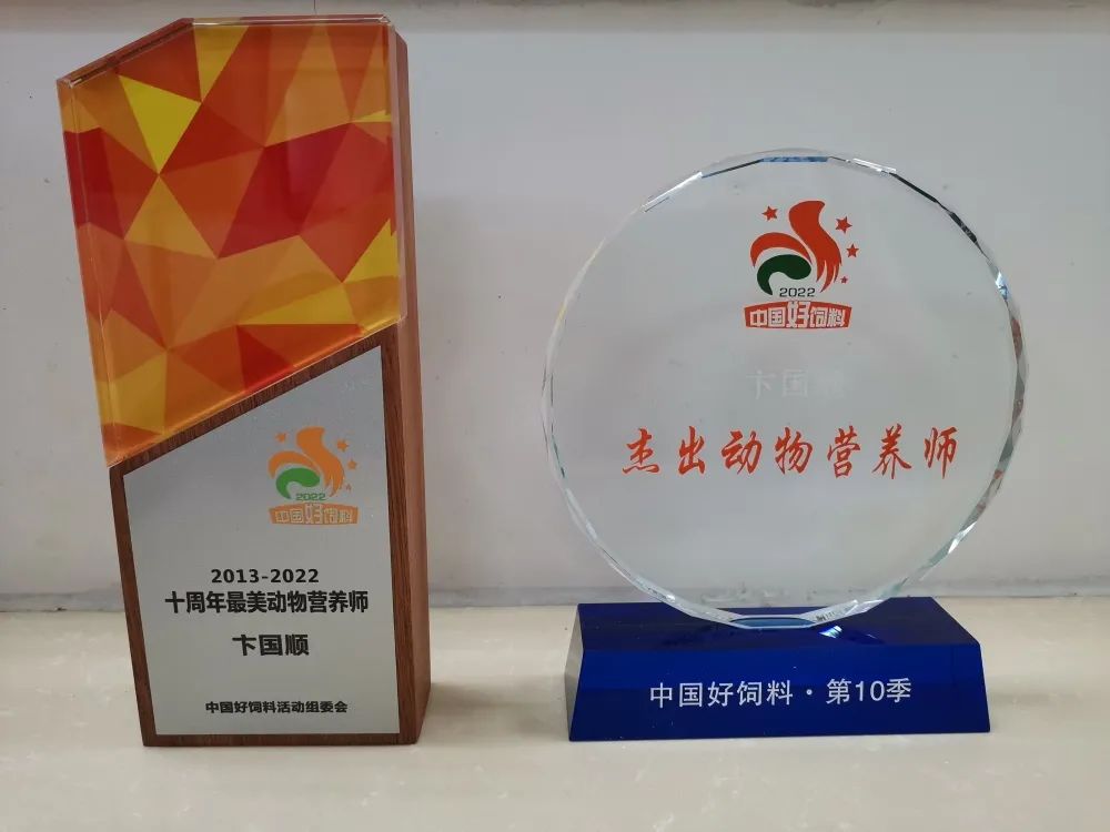 我司副總經(jīng)理、CTO卞國(guó)順先生獲得“杰出動(dòng)物營(yíng)養(yǎng)師、2013-2022十周年最美動(dòng)物營(yíng)養(yǎng)師”的榮譽(yù)。