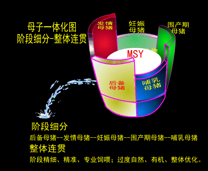 根據母豬繁殖生理、母豬繁殖病理、胎兒生長發育、母仔關系、飼養管理、動物營養、飼料工藝、生產環控等特點,現代雜交瘦肉性母豬必須“階段細分、整體連貫”,即階段精細、精準、專業飼喂;過渡自然、有機、整體優化。