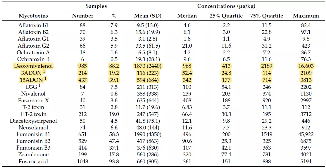 據(jù)Weaver等(2021)發(fā)表在Toxins上一篇持續(xù)7年、累計(jì)828個(gè)樣品、對(duì)35種霉菌毒素的調(diào)查報(bào)告,單胃動(dòng)物日糧的主要原料玉米樣品(n=711)中,萎蔫酸(FA)和嘔吐毒素(DON)成對(duì)出現(xiàn)的概率最大,為0.591(p<0.001)。而萎蔫酸檢出時(shí),伏馬毒素B1、B2、B3(FB1、FB2、FB3)出現(xiàn)的概率較大,分別為0.513(p<0.001)、0.417(p<0.001)、0.326(p<0.001),詳見(jiàn)表1。